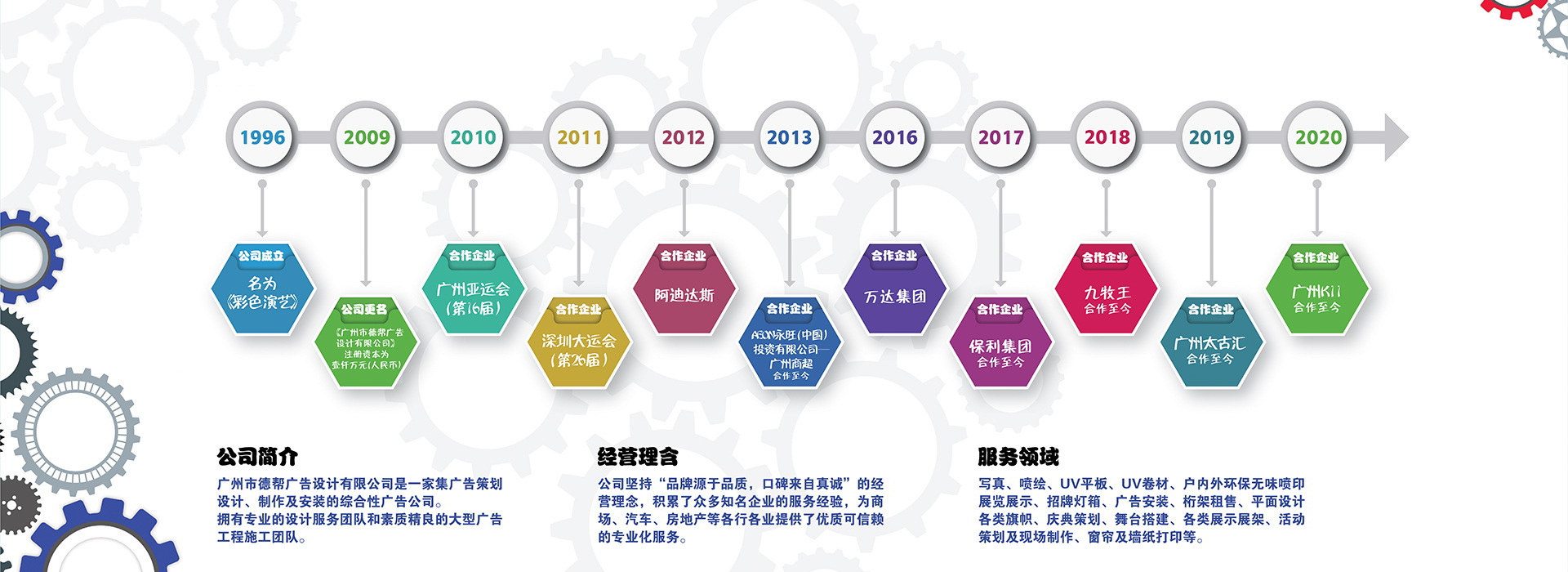 廣州市德幫廣告設(shè)計有限公司,是一家集廣告策劃 、設(shè)計及制作安裝于一體的綜合性廣告服務(wù)商,公司(原彩色演藝噴繪)成立于1996年,公司擁有惠普、愛普生戶內(nèi)外寫真噴繪機20臺,HP latex環(huán)保乳膠墨水打印機2臺,大噴機10臺,UV平板卷材機6臺,全自動智能切割機4臺等高端設(shè)備,專業(yè)的設(shè)計制作團隊和素質(zhì)精良的大型廣告工程施工團隊,廠房面積達(dá)3000平米。公司主要經(jīng)營戶內(nèi)、外寫真、噴繪、廣告工程的制作、平面設(shè)計、燈箱、招牌等業(yè)務(wù),公司所有的設(shè)備采用進(jìn)口設(shè)備、后期制作自動化,生產(chǎn)速度快、質(zhì)量第一。與方圓地產(chǎn)、萬達(dá)廣場、招商地產(chǎn)、萬科地產(chǎn)合作,主要制作內(nèi)容:廣告活動物料、圍墻的生產(chǎn)、安裝、桁架的搭建、活動執(zhí)行、高空安裝、燈旗的制作及安裝等業(yè)務(wù)。公司先后榮獲廣州地區(qū)十佳廣告工程制作公司、中國商務(wù)廣告協(xié)會廣告工程分會會員單位、全國噴繪企業(yè)入圍品牌公司等諸多榮譽。至今已發(fā)展成為華南地區(qū)大型的廣告產(chǎn)品供應(yīng)基地。并以“產(chǎn)量高、質(zhì)量好、交貨快”的經(jīng)營模式贏得了廣大客戶的稱贊。并堅持“品牌源于品質(zhì),口碑來自真誠”的經(jīng)營理念,積累了眾多知名企業(yè)、政府機構(gòu)的服務(wù)經(jīng)驗,為大型活動、商場超市、汽車、房地產(chǎn)等各行業(yè)提供了優(yōu)質(zhì)可靠的專業(yè)化廣告服務(wù)。旨在協(xié)助客戶提升品牌形象,并以建立長期品牌價值為使命,讓各行業(yè)的品牌形象結(jié)合產(chǎn)品推向市場,贏得足夠的社會關(guān)注,幫助企業(yè)品牌成長。